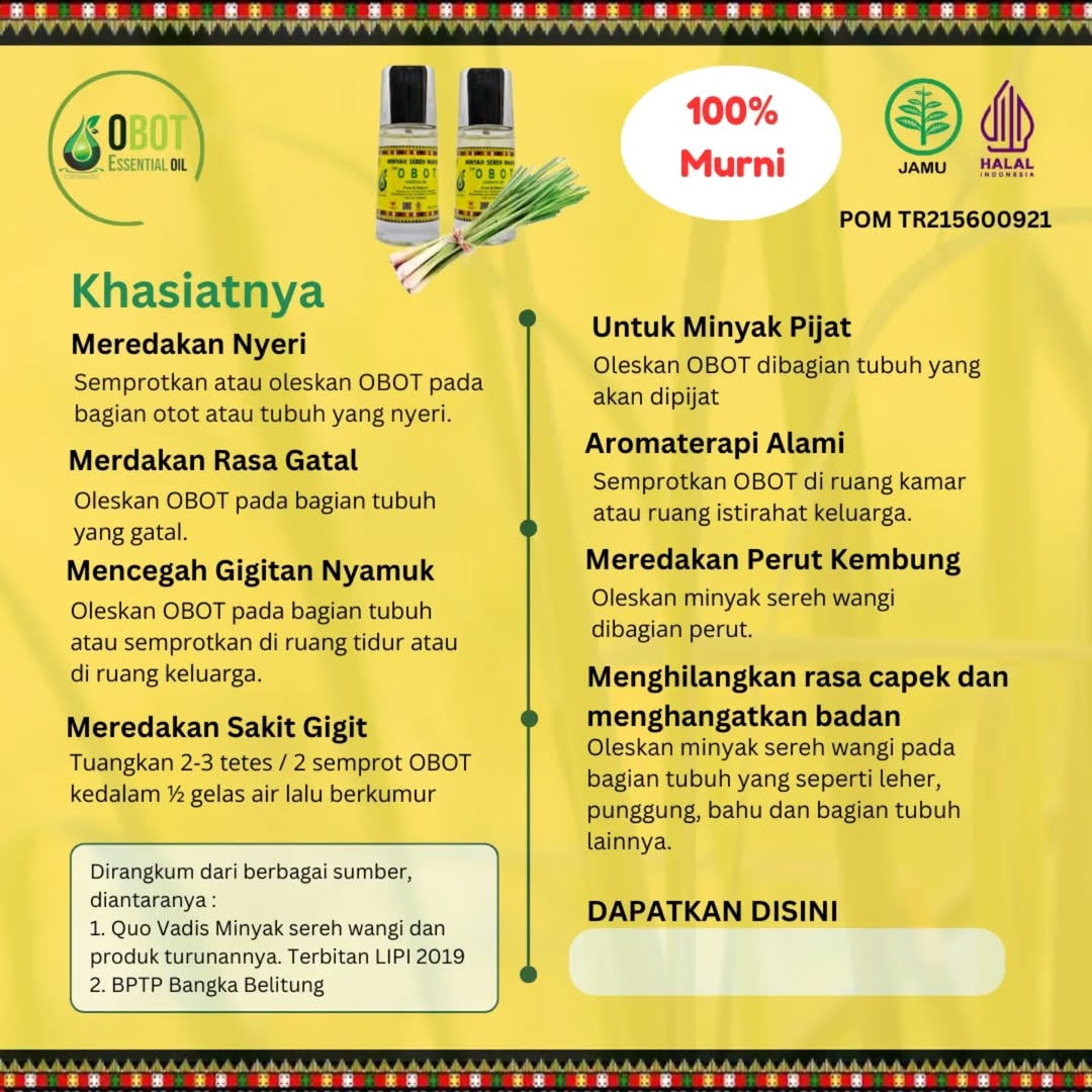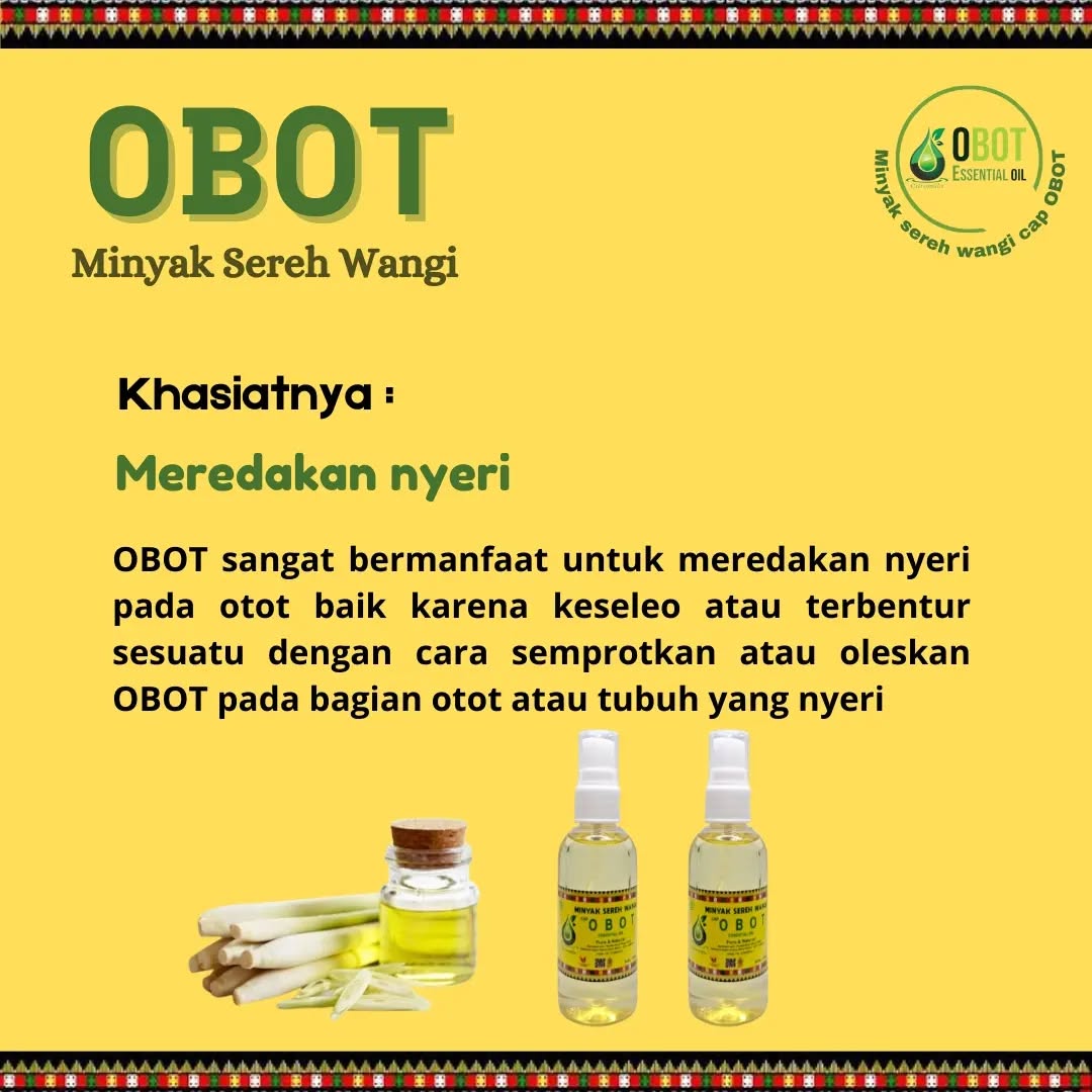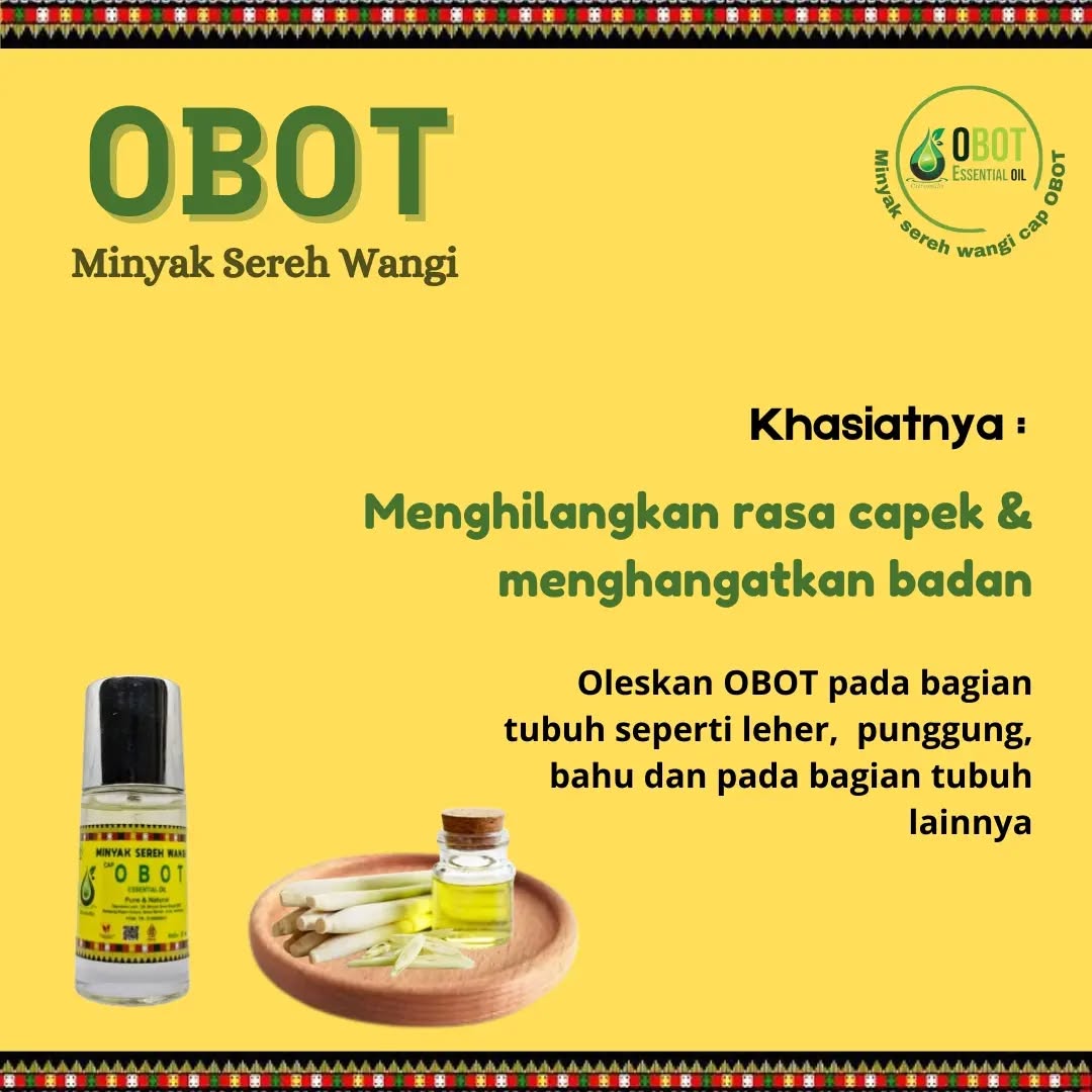 Minyak Sereh Wangi Cap OBOT 100% Murni disuling dari Perkebunan Pondok Sereh Wangi OBOT Kampung Negeri Antara, Kec. pintu Rime Gayo Kab. Bener Meriah – Aceh