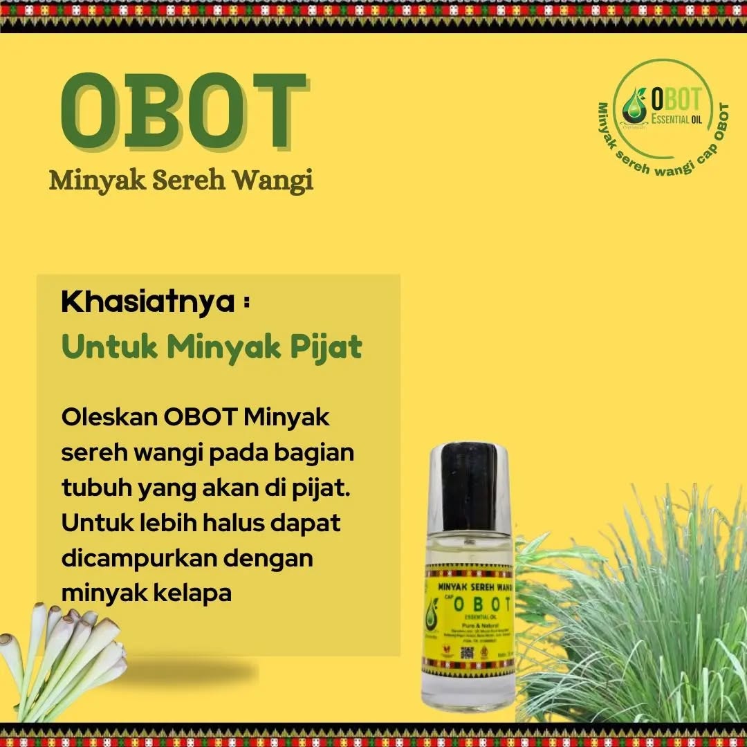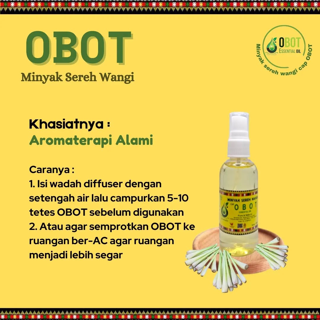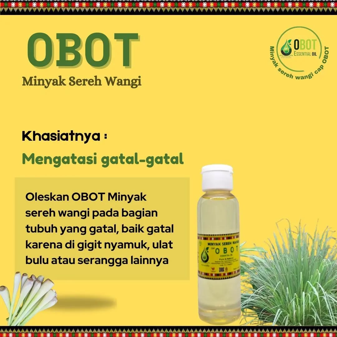 Minyak Sereh Wangi Cap OBOT 100% Murni disuling dari Perkebunan Pondok Sereh Wangi OBOT Kampung Negeri Antara, Kec. pintu Rime Gayo Kab. Bener Meriah – Aceh